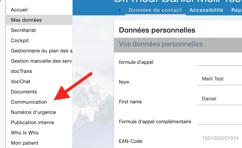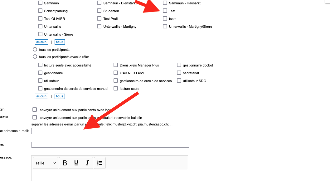 Vous cliquez sur Communication sur le côté gauche, puis vous choisissez sur le côté droit les participants auxquels vous voulez envoyer un e-mail. Il est encore possible de saisir des adresses e-mail qui ne sont pas enregistrées dans la docbox.